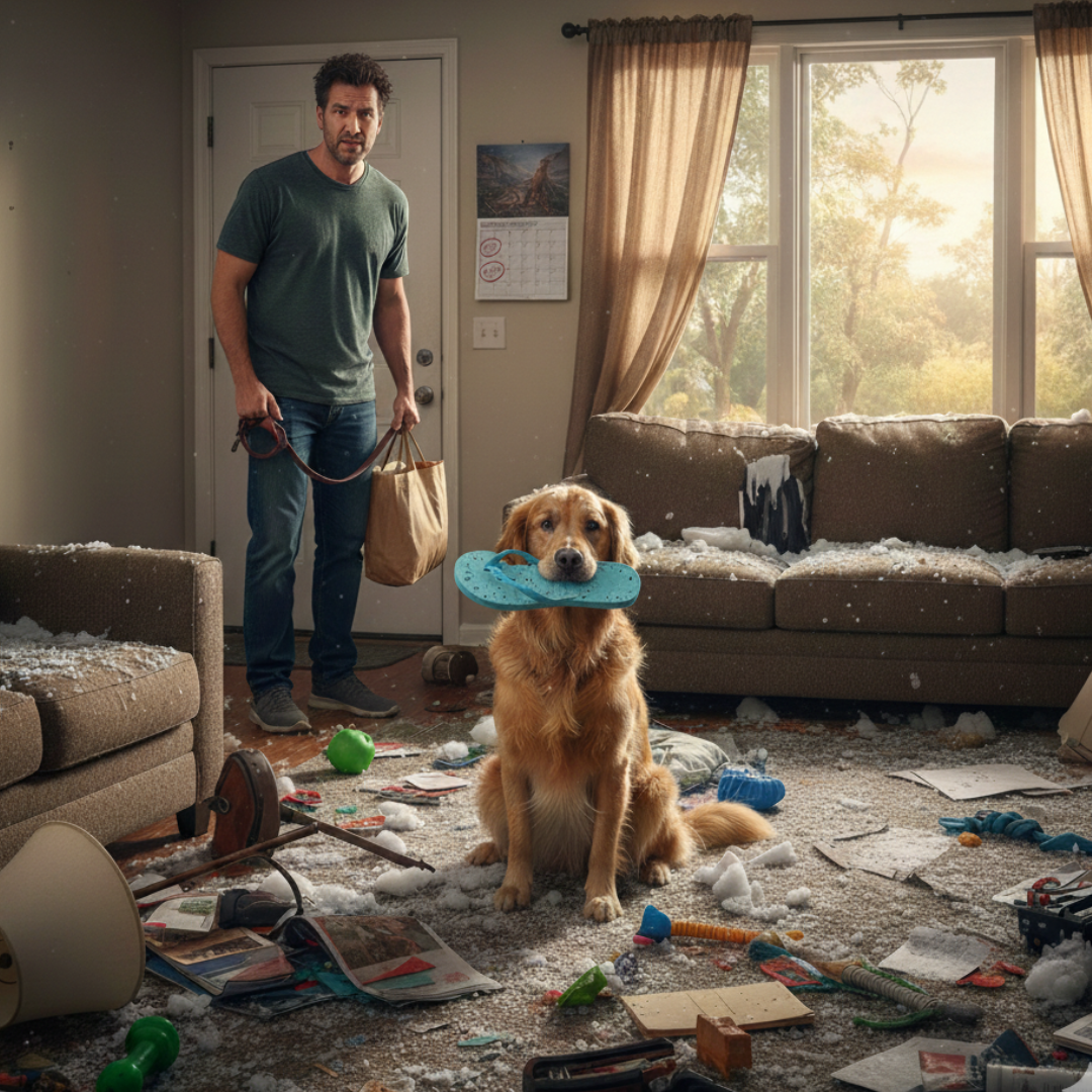 1️⃣ Sai de casa e volta com medo do que vai encontrar, porque seu cachorro late, destrói e come toda casa quando fica sozinho.
