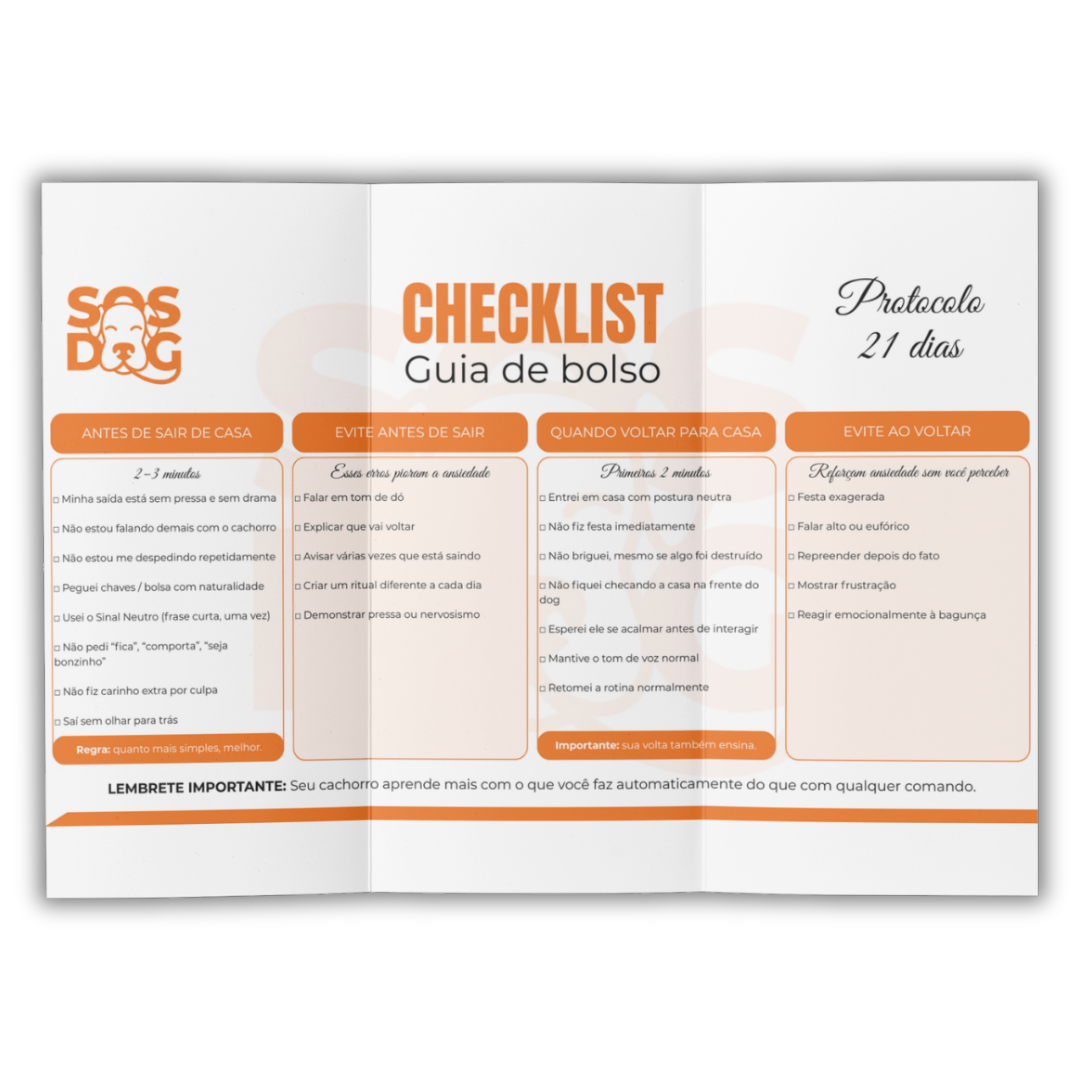 Um checklist em formato de guia de bolso, simples e direto, com o que fazer nos minutos mais importantes do dia: antes de sair de casa e logo ao voltar. Ele evita os erros mais comuns que aumentam a ansiedade do cachorro e ajuda a manter a rotina correta mesmo nos dias corridos.